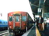 | (評)日本の最南端の駅西大山から最北端の駅稚内へ鈍行だけで向かった5日 間であった。越後線や米坂線の初乗りを含めて旅の印象はいきおい北に行くほど 強くなってくる。西大山を出た日は風は強いものの、まだ厚手のワイシャツ1枚 で外を歩けたが、米坂線あたりから北は一面の雪原が広がっていた。山形から青 森にかけては、今はなき50系客車レッドトレインの独壇場。当時放送されていた 角松敏生のFM番組を聴きながら、大いに酔っ払った。北海道に入ってからはいよ いよ冷え込みがきつくなり、もちろんコートなしでは過ごせなかった。名寄から 乗った最後の列車は、凍てつく手塩川沿いをゆったりと走り、抜海の丘を越えて 稚内の街の灯を見下ろしながら聴いたデレク&ドミノスのレイラの終盤のピアノ のコードバッキングとクラプトンのギターの泣き具合には涙がこぼれそうになっ た。 | 弘前にて50系客車と筆者 |