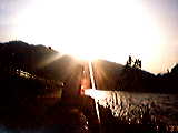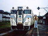 | (評)前半の3日くらいは、梅雨時とはいえほとんど快晴であった。夕暮れの 茂市で、列車待ちを利用して付近を流れる川のほとりで佇み「あぁ、旅に出たん だぁ」という想いが湧き起こった。盛岡での列車待ちでぶらぶらした、北上の流 れもよかった。この旅のトワイライトセクションは、海に沈む夕日を車窓の供に した大湊線。また、梅雨空に戻った10日(土)の陸羽東線で、青々とした田園地帯 を走りながら聴いたエリック・クラプトンの「ホーリー・マザー」は今でも梅雨 時になるとその情景が思い浮かんでくるほどである。最終日は東北ワイドの威力 で特急を乗り継いでぐるっと東北を一回りした。 | 左沢線気動車と筆者 |