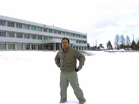 | なにせ5年ちょっと前に1泊しただけの町である。当時の記憶はすっかり褪せていて、「確か駅に向かう時に下り坂で滑って転んだような…」というあいまいな記憶をたよりに、古牧温泉へと向かうことにした。駅の正面にまっすぐ登っていく坂道があった。「たぶんこの道だろう」とあたりをつけて歩き出した。400bくらい登って下り坂になるころ、ようやく道の間違いを悟った。かといってこのまま逆戻りするのは、坂道で抜いてきた地元人たちの手前があり恥ずかしい。辺りを見回すと「古間木小学校→」の看板を発見。冬休みの誰もいない小学校を見るのも一興と思い学校への坂道を登った。 AFNはサンタナの新曲を流していた。「この人、またグラミー獲っちゃうよ」と思いながら、軽快なラテンのリズムに歩調をあわせてゆっくり坂を登った。古間木小学校のグランドは一面の雪原だった。このシーンに見覚えがある気がした。「東京ラブストーリーだ!!」10年ちょっと前のこのTVドラマのクライマックスで雪が積もった学校が登場した。その当時なら「カンチ」と呼ばれてもおかしくない容姿だった(?)私も、いまではこんな姿に成り果ててしまったなぁ。そんなことにもめげすに私はセルフタイマーで自分の姿をおさめ、小学校を後にした。 |