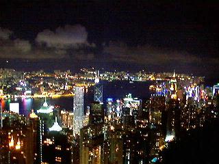 実はビクトリアピークの展望台には2日め(6月26日)の昼間にも訪れ、その見晴らしの良さを堪能していたのだが(デジタルカメラによる画像はその日の夕刻消失=前述)、その昼間の風景を忘れてしまうような美しい夜景であった。このような夜景を写すんだったらデジカメの独壇場。上の画像のような夜景をバシバシ撮っていった。右上の画像の真意を日本に戻ってきてから深谷クンに問いただしたら「女の子の方から手を回してきた」んだってさ!!彼女が聴いたら泣くようなコメントをしていた。とにかく夢のように過ぎ去ったビクトリアピークでの時間だった。 山頂から下る帰り道の途中に、ハッピーバレーの電飾ドラゴンが良く見える展望台でバスが停まってくれた。このドラゴンの電飾は6月いっぱいまでということなので、もう今香港に行ってもないはずである。貴重な画像を収めることができてヨカッタ!! まぁ、何はともあれこうして日本でホームページをまとめることができてめでたしめでたし。仕事とはいえ、充実した香港での4日間であった。