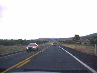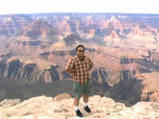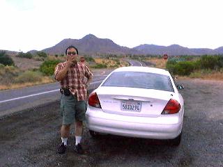 一日目:グランドキャニオン往復 2003年7月24日(木)朝8時30分、滞在中のサハラ・ホテルを出発し、レンタカーの予約を入れているハラーズ・ホテルに 日本で「ムスタング・クーペか同等クラス」のクルマを予約しておりワクワクしていたが、実際のクルマは「トーラス」というファミリーカーでガッカリした。このトーラスがクセモノで、運転席のシートの前後調整の仕方がさっぱり分からない。シートの下を見るとモーターらしきものがついており、パワーシートのようだが、やっぱり動かし方が分からない。助手席に座っていたY君と代わり、彼がガチャガチャいじくり回って15分後ようやくシートが動いた。 とりあえず私の運転で、遥か275マイル(440`)先のグランドキャニオンに向けてスタート。なにせ事前の下調べを全くしないまま公道に飛び出してしまったため、相当あたふたしまくった。インターステート(高速道路)15号(以下I-15と表記)からI-515のジャンクションで、奇跡的に正しい方向に曲がれたため、最短距離で目指す南に向かうことができた。 |