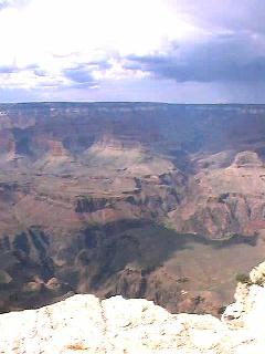 続いて写真撮影。クルーズコントロール(アクセルを踏んでいなくても車速を一定にする機能)を70マイルにセットして、スピードメーターを写したり、Y君に私が運転している姿を撮ってもらったりした。カメラを再び後部座席に置こうと後ろを振り向いた瞬間、悲劇が襲った。右側の砂利の路肩にタイヤを落とし、慌てた私は左に急ハンドルを切った。するとクルマは安定を失いスピン。急ブレーキの音とタイヤの焦げる匂いが恐怖心をあおる。ちょうど一回転して左側(中央寄り)の路肩に停止した。後ろを振り返ると、道路に黒々とタイヤの軌跡がまぁるく残っていた。幸い人車ともにキズひとつなかったが、時速112`でスピンしているだけに、ひとつ間違えれば大惨事であった。この後、運転中わき見をしないように誓ったのはもちろん、クルーズコントロールのスイッチにも一切手を触れないようにした。 国道93号とI-40とのジャンクションであるキングマンという町が、ラスベガスからちょうど100マイルの地点である。ここからフリーウェイを東に向かう。アメリカの高速道路は料金不要でうらやましい限りだが、反面、日本のようなサービスエリアが整備されていない。人車とも食いっぱぐれると次の給油エリアまで50〜60マイルはザラである。人間なら我慢もできようが、クルマではそうもいかず早め早めの給油が肝要である。 キングマンを出て20マイルくらい東に向かったところにあるインターチェンジでドライバーを交代した。Y君は海外で運転するのも、右側通行も左ハンドルもすべて初体験である。運転から解放された私は、雄大なフリーウェイの景色を次々とカメラに収めた。I-40を走ること1時間半。ようやくグランドキャニオンへの玄関の町ウィリアムズを通過した。ここで再度ドライバーを交代。ウィリアムズは玄関の町といっても、ここからグランドキャニオンまでは、片側1車線の州道64号と国道180号を経由して55マイルもある。ウィリアムズから少し北上したキャンプ場で遅めの昼食(フライフィッシュ&ポテト)を摂る。14時を回っていた。 グランドキャニオンに到着したのは15時過ぎ。前回ここに来た時にはラスベガスから飛行機で45分だった。今回は陸路を延々5時間以上も走っての到着なので感慨ひとしおである。特にグランドキャニオンが初めてだったY君は、しばらく感嘆の言葉しか発しなかった。午後の遅い時間に到着したおかげで、太陽が真上にある時間よりも峡谷の陰影がくっきりとしている。私も改めて「来てよかった」と感じた。 山の天気は変わりやすく、1時間くらい滞在している間に、空はにわかに暗くなり、雷鳴が轟き始めた。そのうち稲光がはっきりと見られるようになり、それをしおにグランドキャニオンを後にすることにした。クルマに戻ってから5分経つか経たないかのうちに土砂降りになった。 |