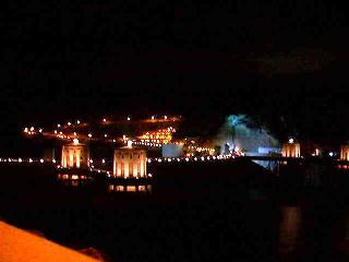| ワイパーも利かないほどの激しい雨の中、もと来た道を戻る。ウィリアムズに着くころには雨も上がったが、相変わらず空は暗く、日没後のようである。ところがI-40に入ると今度は快晴で、西に向かっているため、まともに西日を受けた。そろそろ二人とも疲れが出始め、フリ−ウェイ担当ドライバーのY君はキングマン直前でギブアップした。 キングマンから再び国道93号を北上する。20時近くになり、ようやく暗くなってきた。眠い目をこすりながら運転をしていると、助手席のY君はスヤスヤと眠っている。突然窓を開けたりして驚かしたりしながら夜のネバダハイウェイを突っ走った。 往路では大勢の観光客で渋滞していたフーバーダム周辺も、夜は交通量も少なくなり、休憩するにはちょうどいい。ライトアップが幻想的だった。 ボルダーシティを通過して数分後、坂の上から高速を下ってくるとラスベガスの夜景が広がる。明日の夜はヘリコプターで夜景を見下ろす予定だが、予期せぬ状態でパッと見せられると感動は大きいものである。徐々にホテル街が近づき、22時少し前にラスベガスに戻ってきた。 |