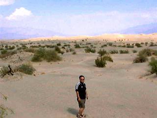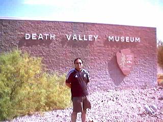 | 当初の予定では、このミュージアムから南に下り、有名な「悪魔のゴルフコース」や「バッドウォーター」を観て帰るつもりだった。しかしデスバレーらしい砂漠は、ここより北に広がっていることが分かり、針路を北にとった。15分ほどクルマを走らせると、西側に干上がった塩湖が白く広がり、一帯は砂漠に変わった。私は「孤独のランナー」気取りでクルマを走らせた。そういえばカーラジオで「孤独のランナー」は昨日1回、今日1回オンエアされた。こういう何も無い道路を走っていると「孤独のランナー」を聴きたくなる気持ちは良く分かる。おそらく放送局でも、20年以上も昔の古い曲だけど、マストアイテムっぽくなっているんだろう。 さらに15分ほど北上して、グレープヴァインというポイント手前で砂丘を見つけ、クルマを降りた。クルマから降りると、サウナの中のような熱気が襲う。おそらく気温40℃は優に超えているじゃなかろうか。早々に記念撮影を済ませて、灼熱の地獄からクルマに逃げ込んだ。 ゴーストタウンのような休憩場所・グレープヴァインでUターンし、もと来た州道190号線を引き返す。さきほどのミュージアムを通り過ぎて、「デビルズ・ゴルフコース」という看板で右折して州道178号線に入る。先ほどのグレープヴァインから45分後、ようやく『悪魔のゴルフコース」に到着した。このようにデスバレーでは、ポイント間の距離が異様に長い。 |