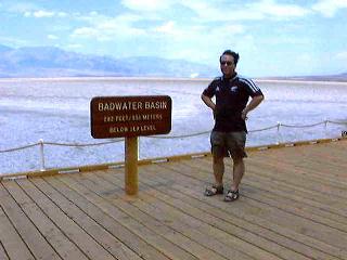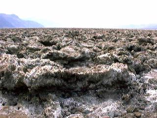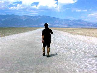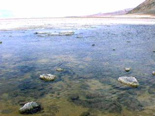 | あたりはクルマのタイヤ大の岩塩がゴロゴロしており、舐めてみると少し塩辛い。この風景を見て「悪魔のゴルフコース」と名付けたアメリカ人の発想力に感心した。 再び南下して5分、今度は「西半球で最も低い場所」という宣伝文句がある「バッド・ウォーター」に到着した。デスバレーでも最も低地であるためかそうでないのか、水溜りのような池があり、久々に水のある風景を見た思いである。池の西側には白い道のように見える干上がった塩湖が延びており、少し歩いてみたが暑いので早々にクルマに引き上げた。 |