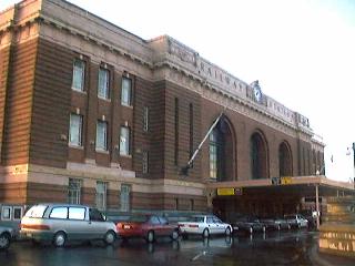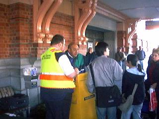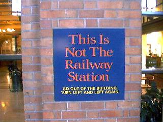 | 2003年7月5日土曜日午前8時、私はオークランド駅に到着した。ホテルから乗ったタクシーは、いったん駅舎と思われる建物の前を素通りし、プラットホームの方向に向かった。しかしそこは工事中で、現場の案内人の指示に従ってもとの駅舎の場所まで戻り私を降ろした。すると私がタクシーから降りるのを見計らっていたように、スキンヘッドの体格のよい中年男性が私に近寄り英語で話しかけてきた。私は彼の話しかけている内容をよく理解できないまま「こいつはポン引きではなかろうか」と判断し、「NO、NO」と彼を振り払い駅舎に入った。 駅舎の車寄せの上には「RAILWAY STATION」と書かれていたのに、駅舎の中には「This Is Not The Railway Station」と掲げられており(右下の画像参照)、訳が分からない。後から考えると鉄道を民営化した時に売却してしまったのかもしれない。結局、件のスキンヘッド氏がどうやらTranz Scenicの人だと分かり、先程の彼の好意を振り払ったバツの悪さを感じながら、臨時のキップ売り場にいた彼に、つたない英語で話し掛けた。 |