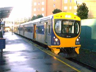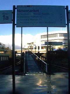 連絡バスでニューマーッケット駅に到着 中学生程度にも満たない英語力で、スキンヘッド氏からオトロハンガまでのキップを買うことに成功したが、キップを買った後に彼が私にした説明は要領を得なかった。「シャトルバス」とか「ニューマーケット」という単語が何回か出てきて、「駅が工事中だからバスで列車のところまで連れていってくれるんだな」というニュアンスを感じ、他の乗客の動向を見守ることにした。ほどなくバスが車寄せのところに停まり、「ウェリントン」などのタグが着いた荷物を持った乗客がバスに乗ることを確認して私もバスに乗った。バスは表通りに出て、休日の朝のオークランド市内をガンガン飛ばした。私は、先程タクシーで連れて行かれた工事中のプラットホームまで連れて行ってもらえるとばかり思っていたので、バスのこの走りっぷりにはかなり不安を覚えた。結局バスは10分くらい走った後、郊外の駅に到着した。 |
